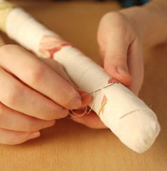 Toliau imamas norimas medžiagos gabaliukas ir apvyniojama jau paruošta pakaba. Medžiaga pritvirtinama siūlu ir adata.