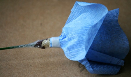 Toliau žiedlapio apačioje tampomas popierius patraukiamas, kad žiedlapis įgautų formą.