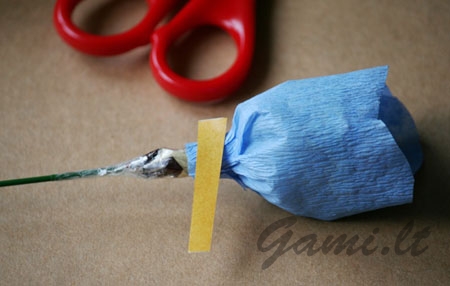 Imame saldainį, jo laisvą popieriuką apvyniojam aplink vielutės galą ir visą tai sutvirtiname lipnia juostele.