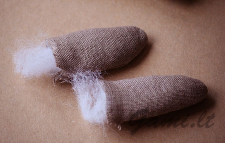 Toliau apdorojamos galvos ir ausų detalės. Pirmiausia išsikirptos galvos ir ausų detalės susiuvamos ir išverčiamos į gerą pusę. Nepamirškite siuvant galvos detales palikti neužsiūtą tarpelį išvertimui.